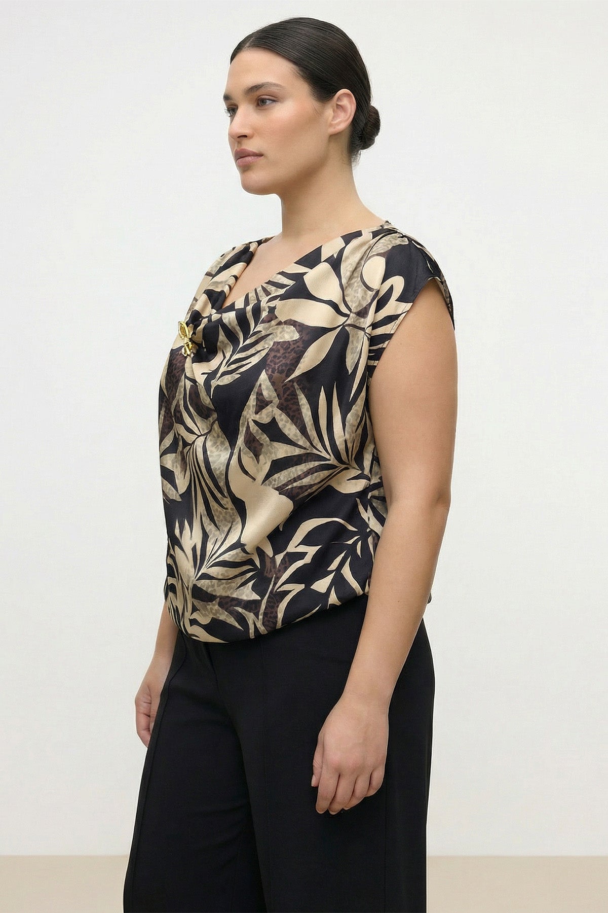 Broş Detaylı Desenli Asimetrik Yaka Saten Bluz
