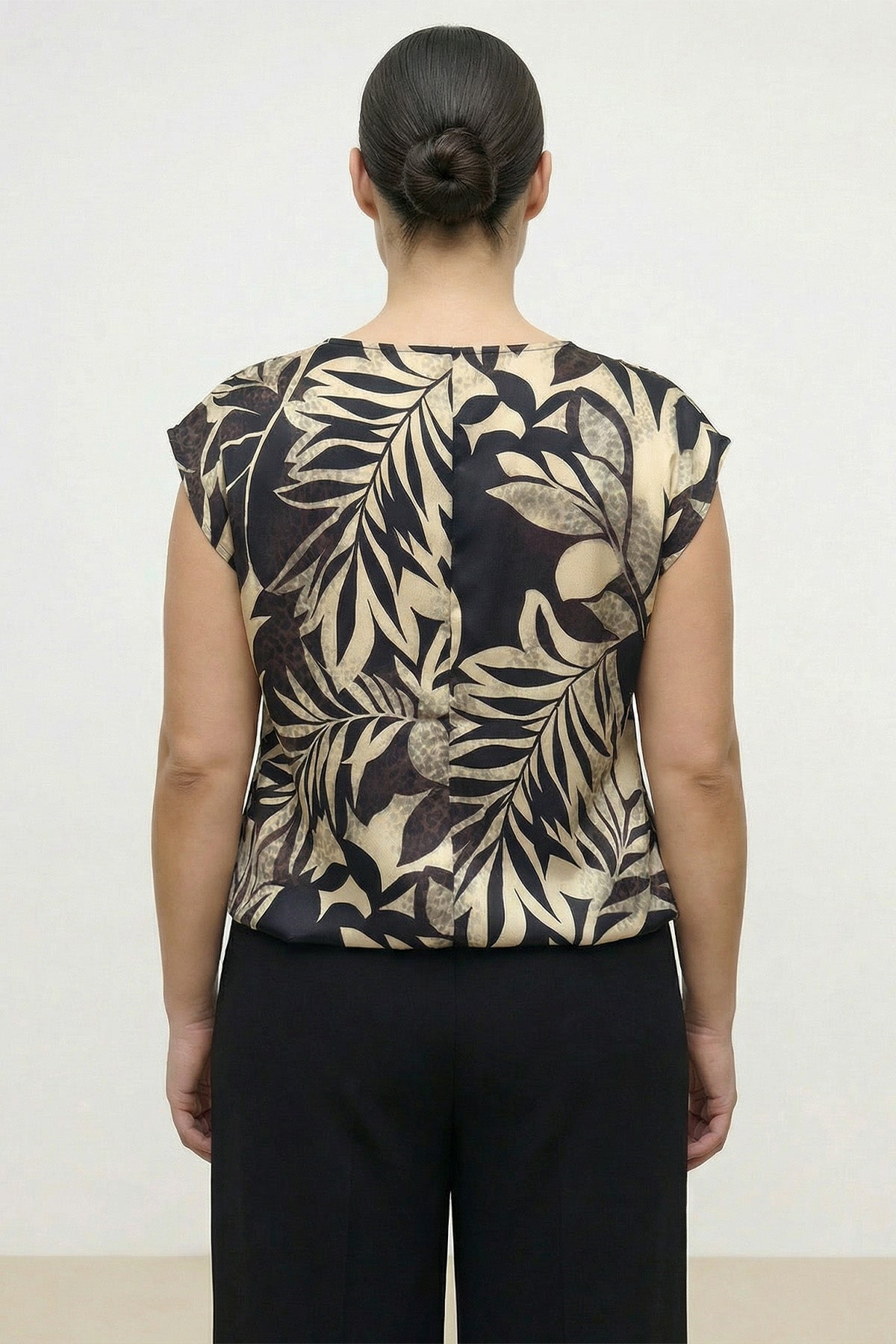 Modern tasarımı ve sanatsal detaylarıyla stilinizi hareketlendiren büyük beden desenli asimetrik yaka bluz, özgün kesimiyle fark yaratıyor. Tasarımın odağında yer alan şık asimetrik yaka hattı ve üzerindeki zarif broş detayı, bluzu klasik modellerden ayırarak sofistike bir havaya taşıyor. Canlı desenleri ve dokuma kumaşının hafif dokusu sayesinde gün boyu konforlu bir şıklık sunan bu parça, kısa kol yapısıyla mevsim geçişlerinde ve sıcak günlerde ideal bir kullanım sağlar. Hem özel davetlerde hem de şık akşam yemeklerinde tercih edebileceğiniz bu bluz, dökümlü yapısı ve dikkat çekici detaylarıyla gardırobunuzun en özgün üyelerinden biri olacak.