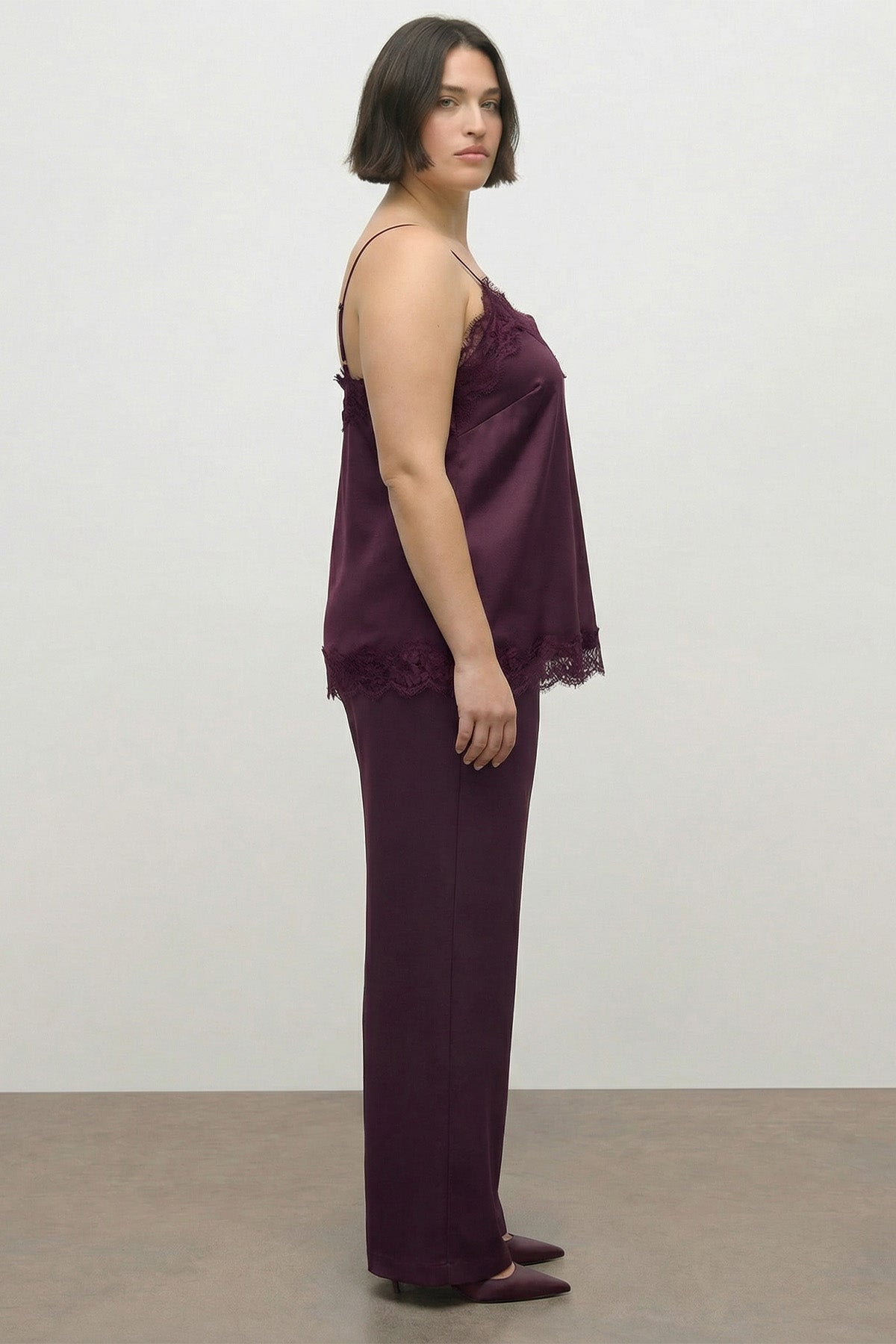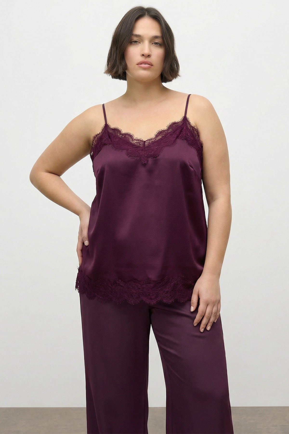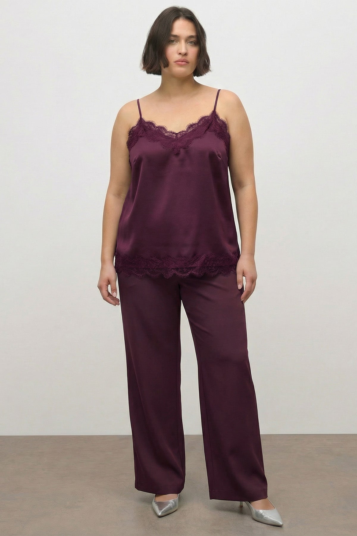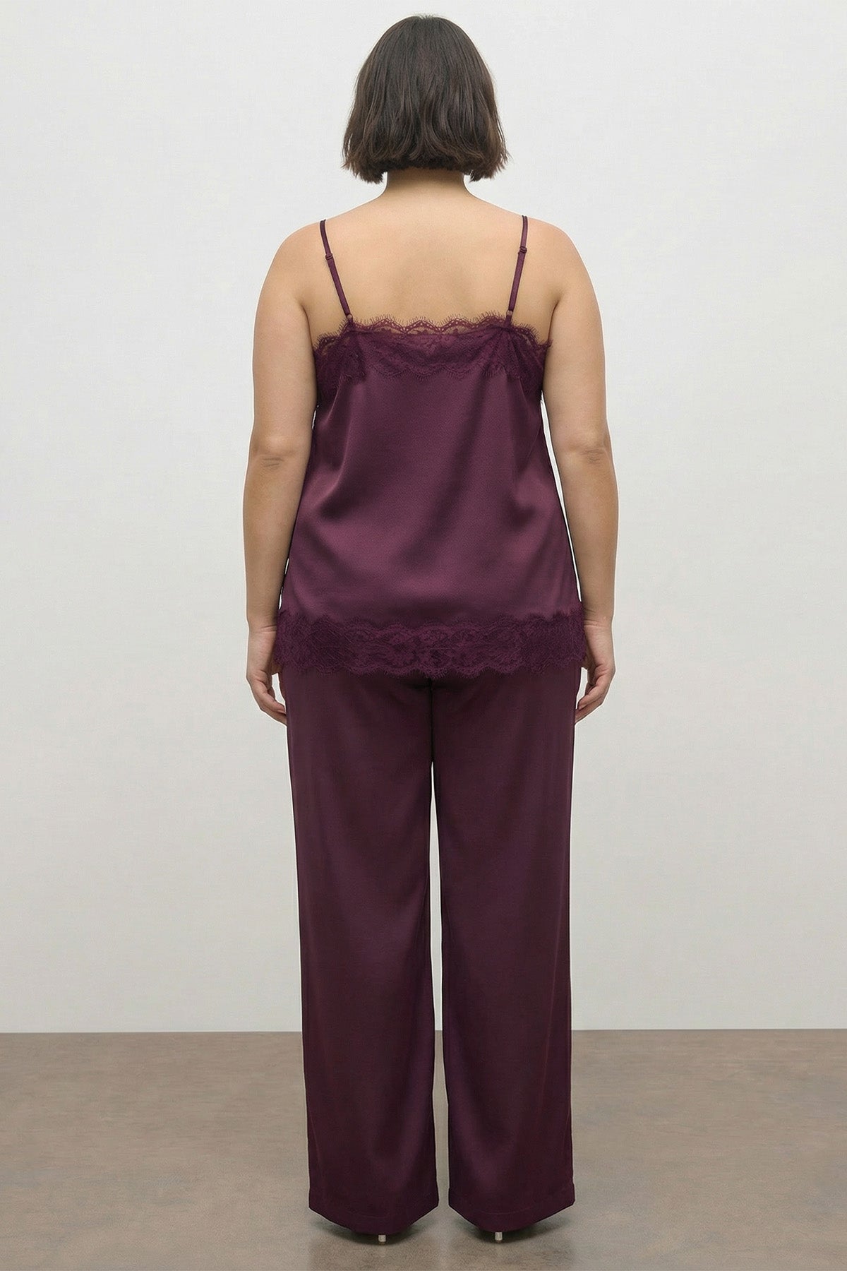 Bordo rengin asaletiyle satenin pürüzsüz dokusunu buluşturan büyük beden dantel detaylı ip askılı saten bluz, stilinize sofistike bir derinlik katıyor. Göğüs dekoltesindeki zarif dantel işlemeleri ve ince ip askı tasarımı, feminen bir silüet oluştururken dokuma kumaşın dökümlü yapısı gün boyu konfor sunar. İpeksi yüzeyi sayesinde cildinizde hafif bir his bırakan bu bluz, şık ceketlerin içine asil bir katman eklemek veya tek başına iddialı bir görünüm yakalamak için idealdir. Hem özel davetlerde hem de şık akşam kombinlerinde vazgeçilmez bir parça olacak bu tasarım, zamansız şıklığı her detayında hissettirir.