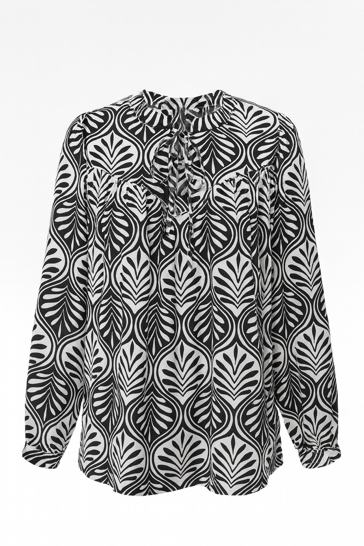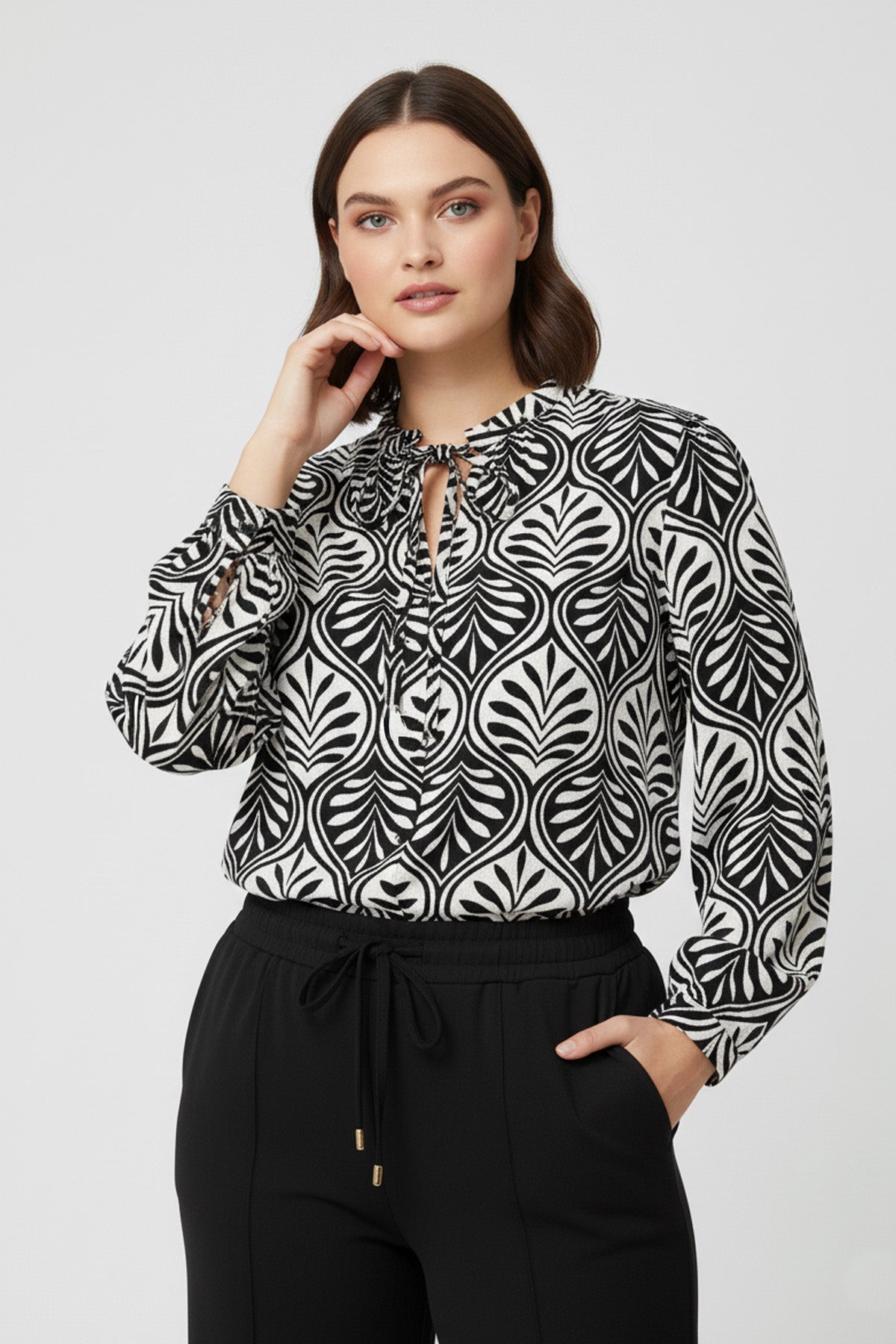 Bejin doğal zarafetini siyahın asil dokunuşlarıyla buluşturan büyük beden bej üzeri siyah desenli bol kesim bluz, stilinize modern ve sofistike bir hava katar. Rahatlığı ön plana çıkaran bol kesim (rahat kalıp) yapısı ve zarif V-yaka tasarımıyla vücut hatlarını yumuşak bir şekilde tamamlar. Yaka kısmındaki ikonik bağcık detayı ve sürdürülebilir moda anlayışıyla üretilen %100 ECOVERO Viskon kumaşı, cildinize nefes aldırırken gün boyu süren bir konfor sunar. Hem siyah pantolonlarla hem de jeanlerle kusursuz bir uyum yakalayan bu bluz, gardırobunuzun en joker parçalarından biri olacak.
