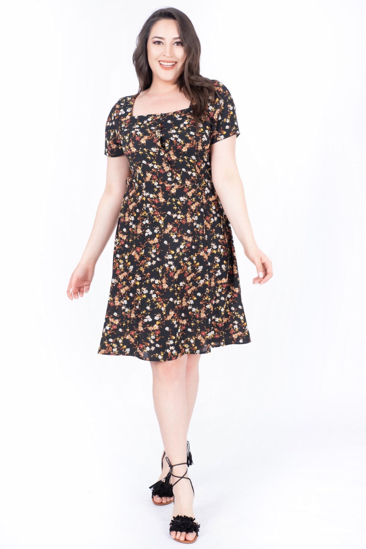 Kare Yaka Çiçekli Elbise
