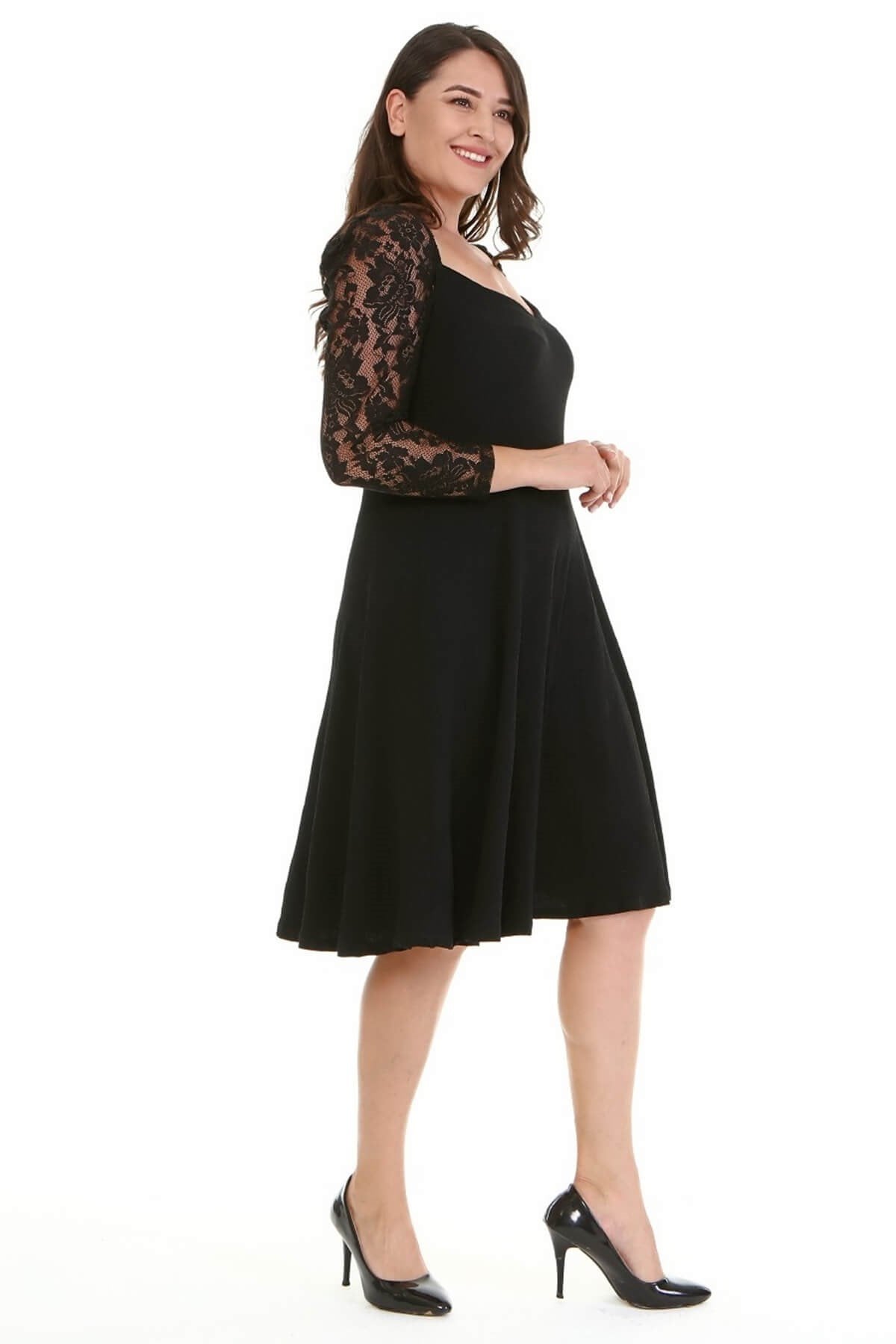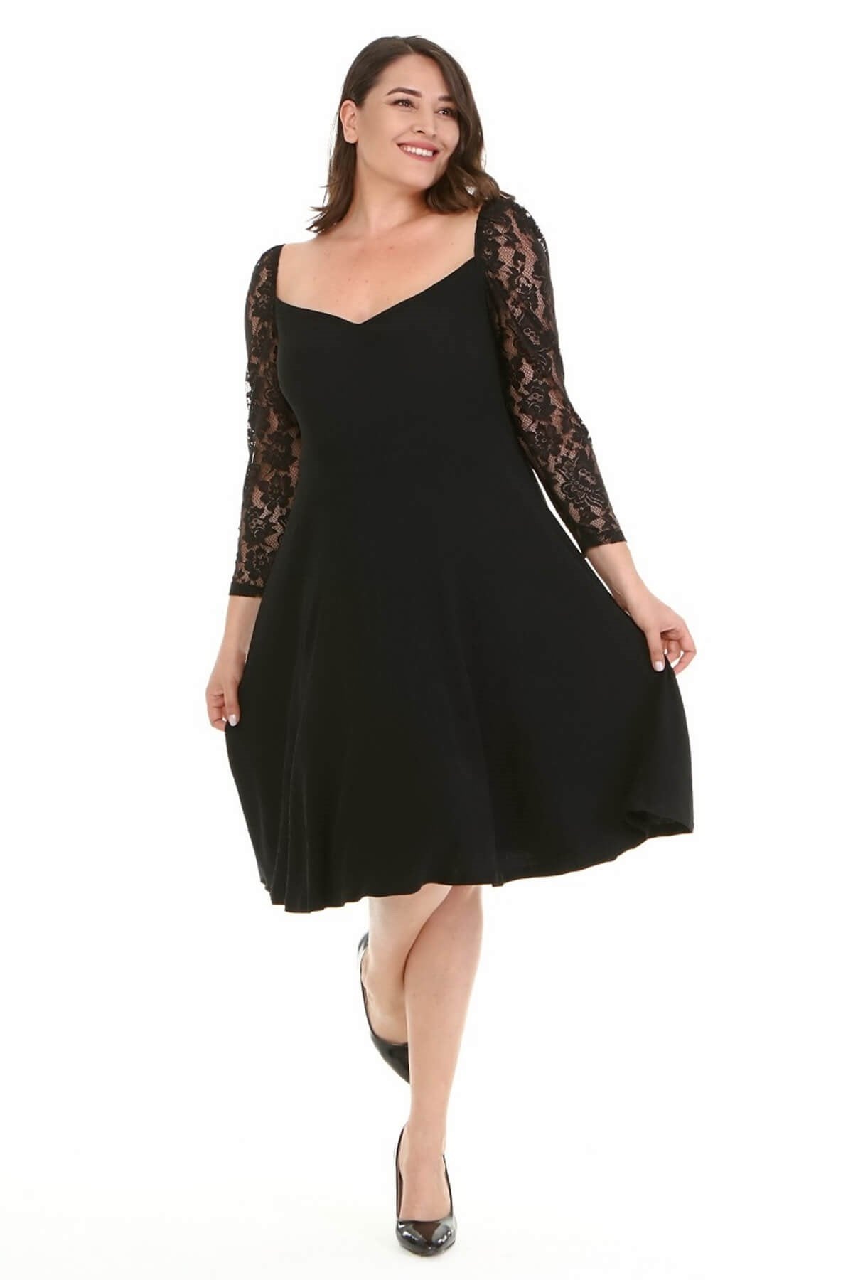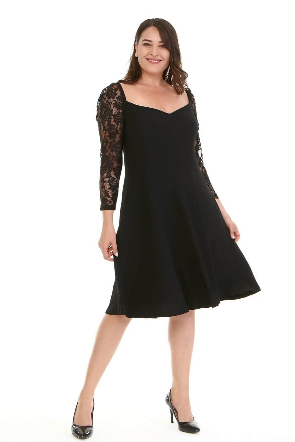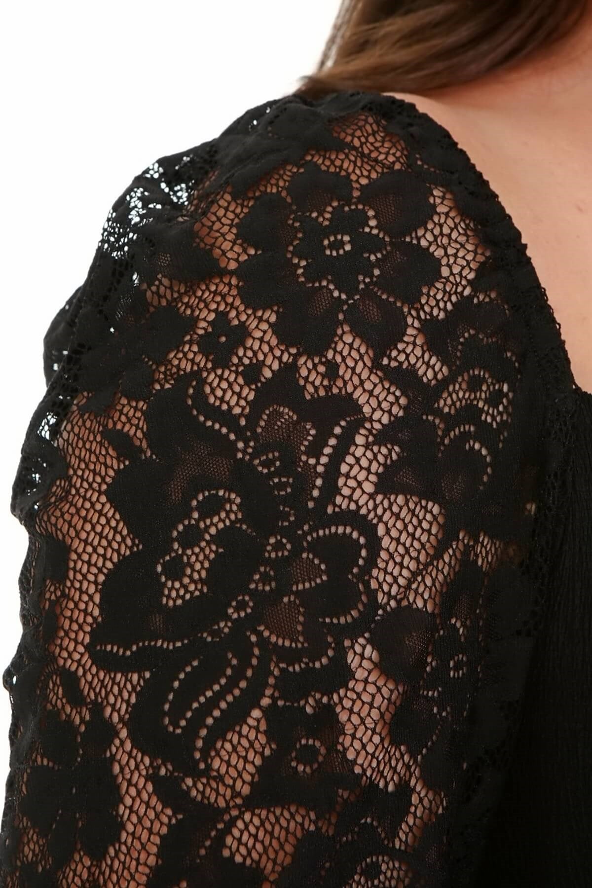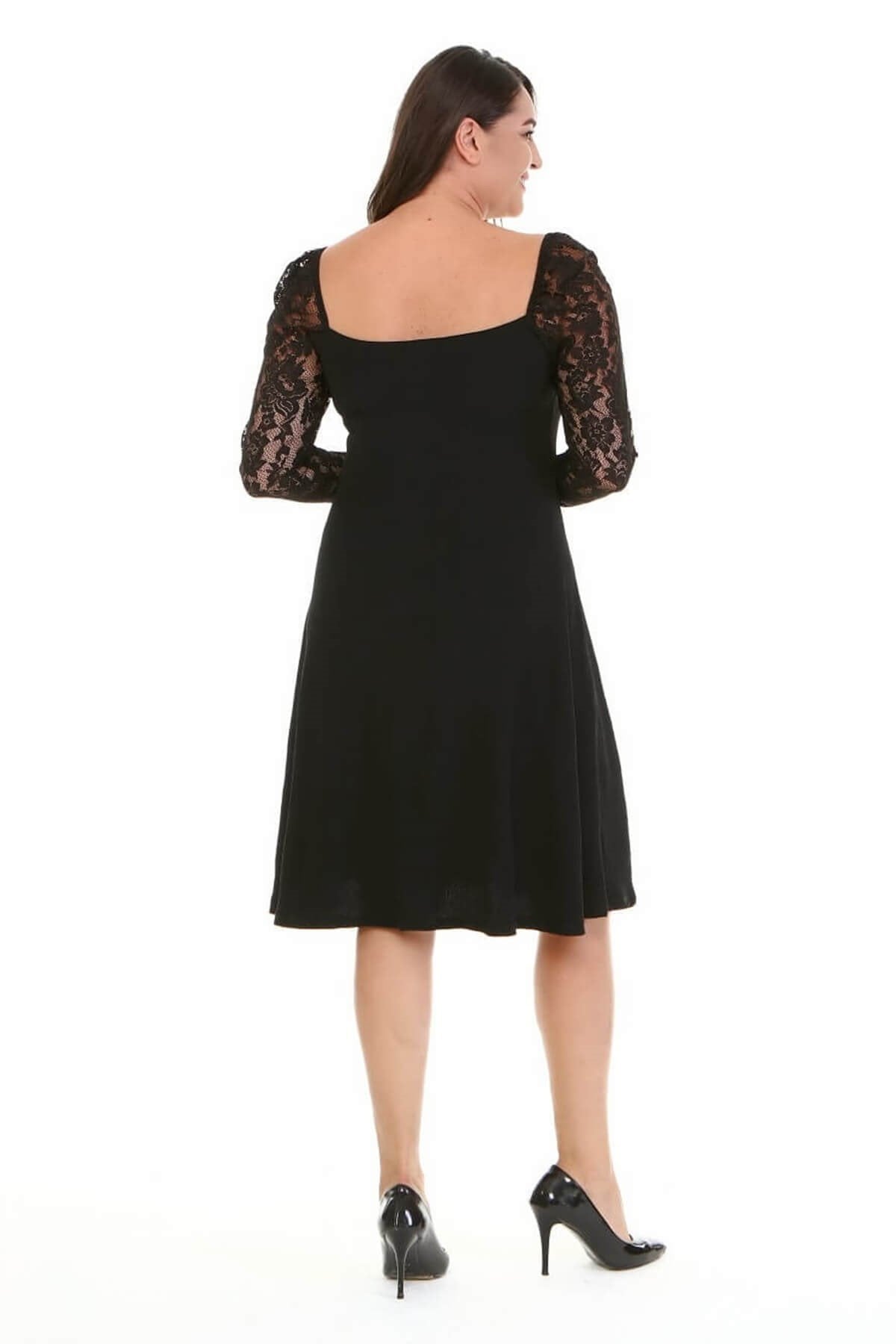 Kare Yaka Kolları Dantelli Elbise