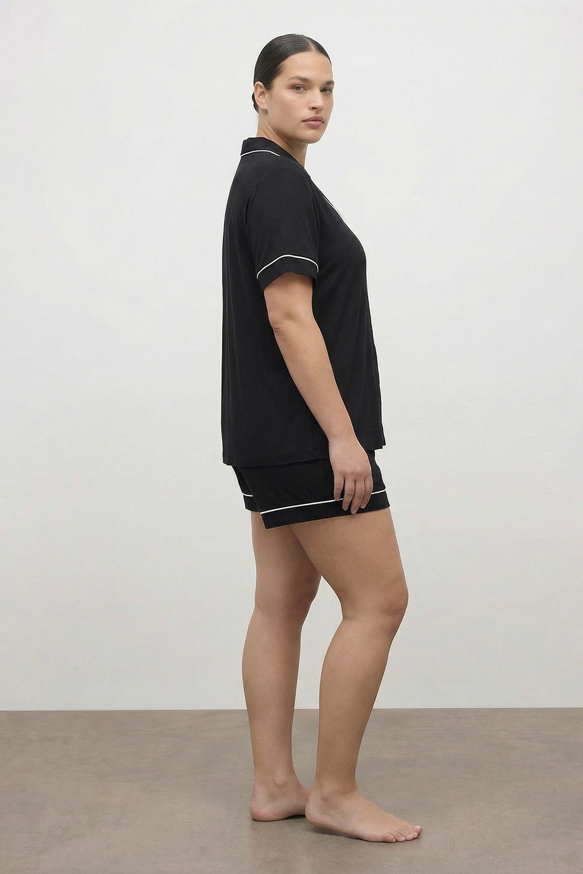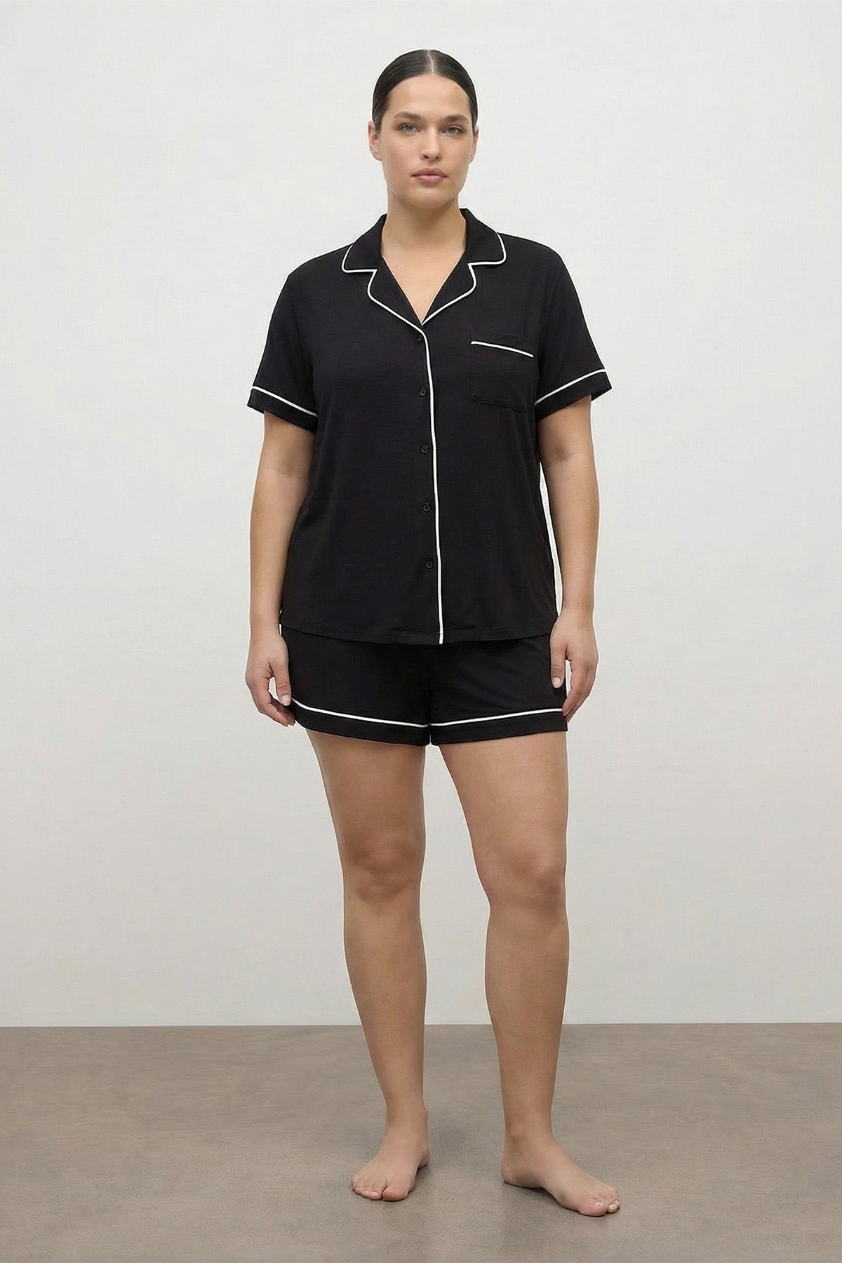 Sıcak havalarda ev konforunuzu zirveye taşıyan büyük beden şortlu penye pijama takımı, yumuşak dokusu ve şık detaylarıyla öne çıkıyor. Klasik pijama yaka tasarımı ve sofistike bir dokunuş katan kontrast biye detaylarıyla ev stilinize zarafet katar. Rahat / Big Size kalıbı ve doğa dostu %96 ECOVERO™ Viskon penye kumaşı sayesinde cildinize nefes aldırır ve gün boyu ferahlık sağlar. Kısa kollu üst parçadaki cep detayı ve konforlu şortuyla hem uyku hem de ev içi kullanım için mükemmel bir tercihtir.