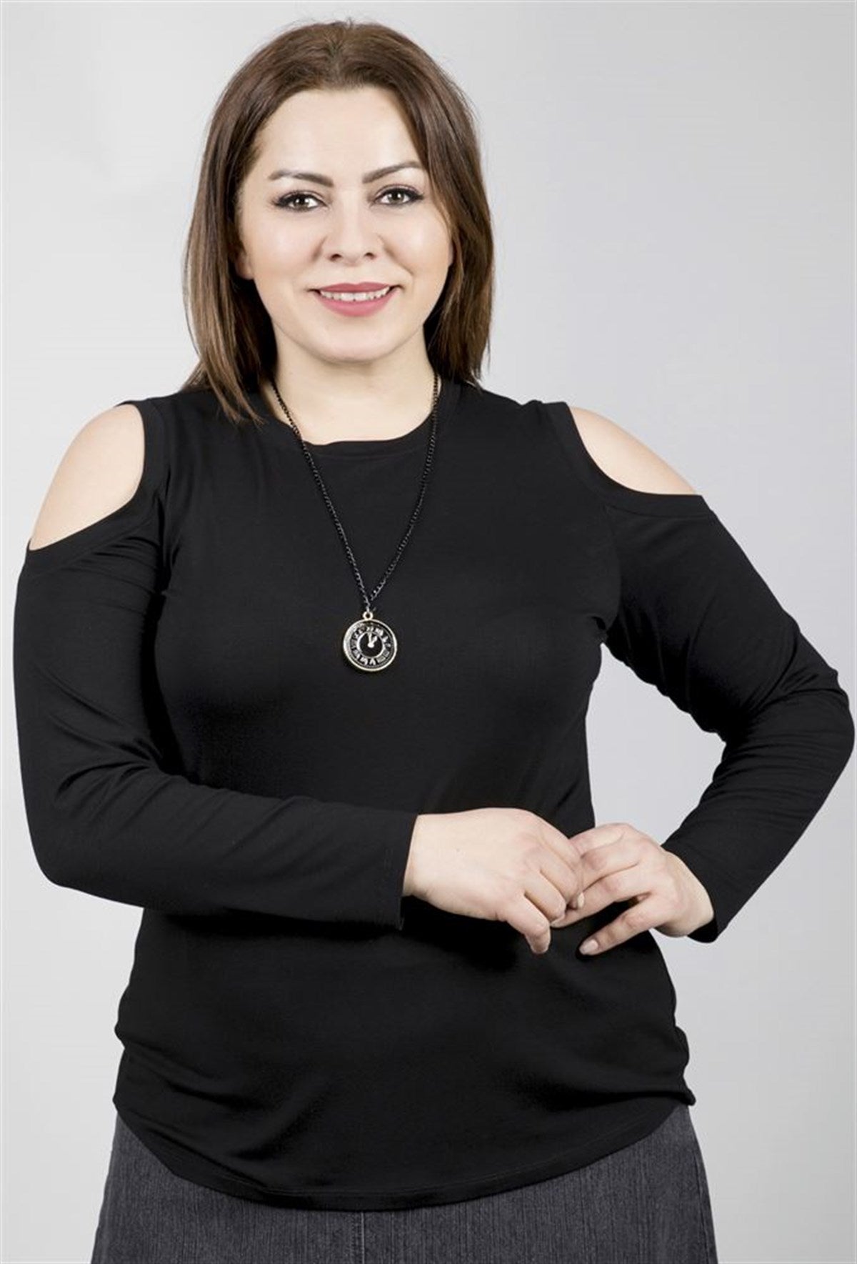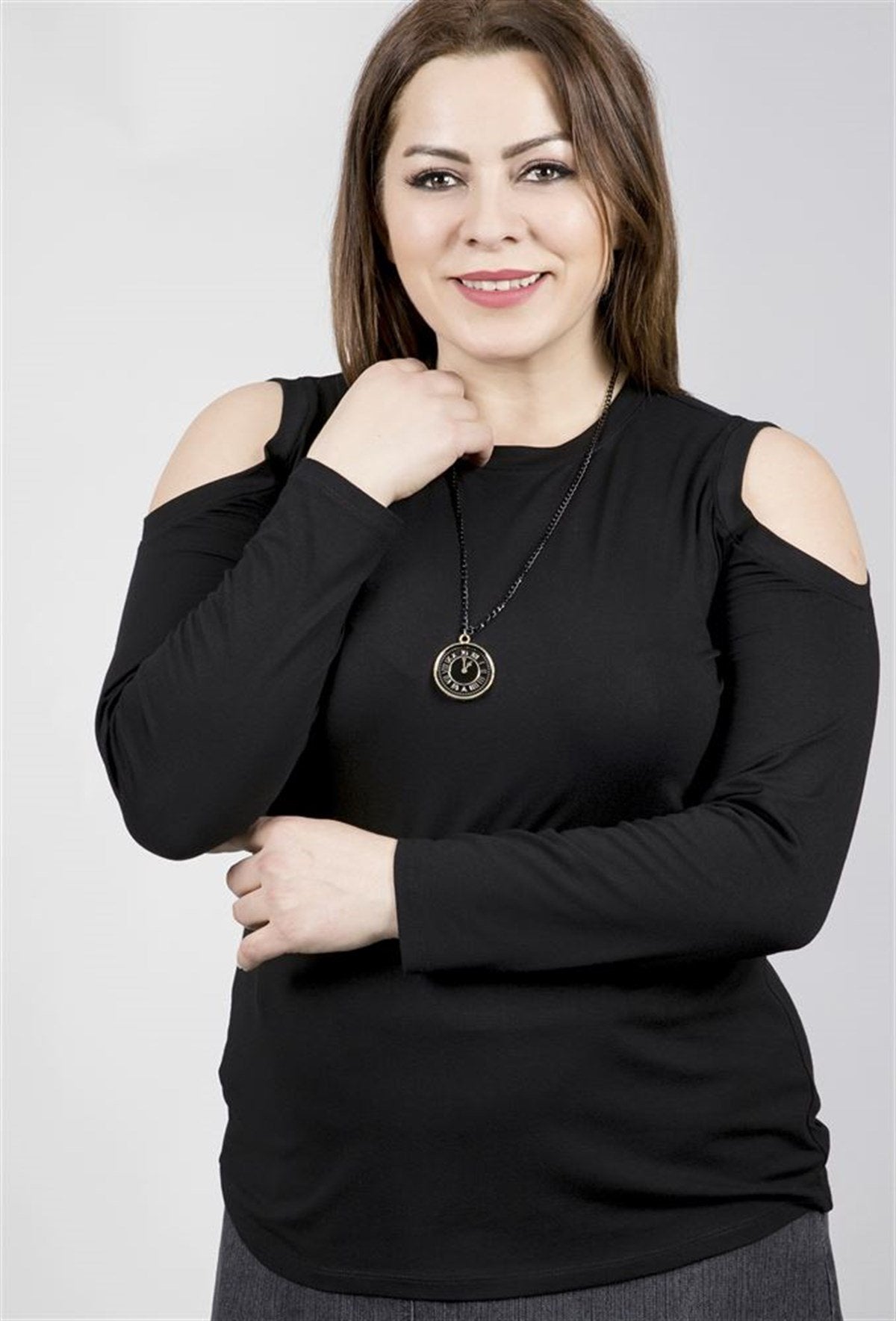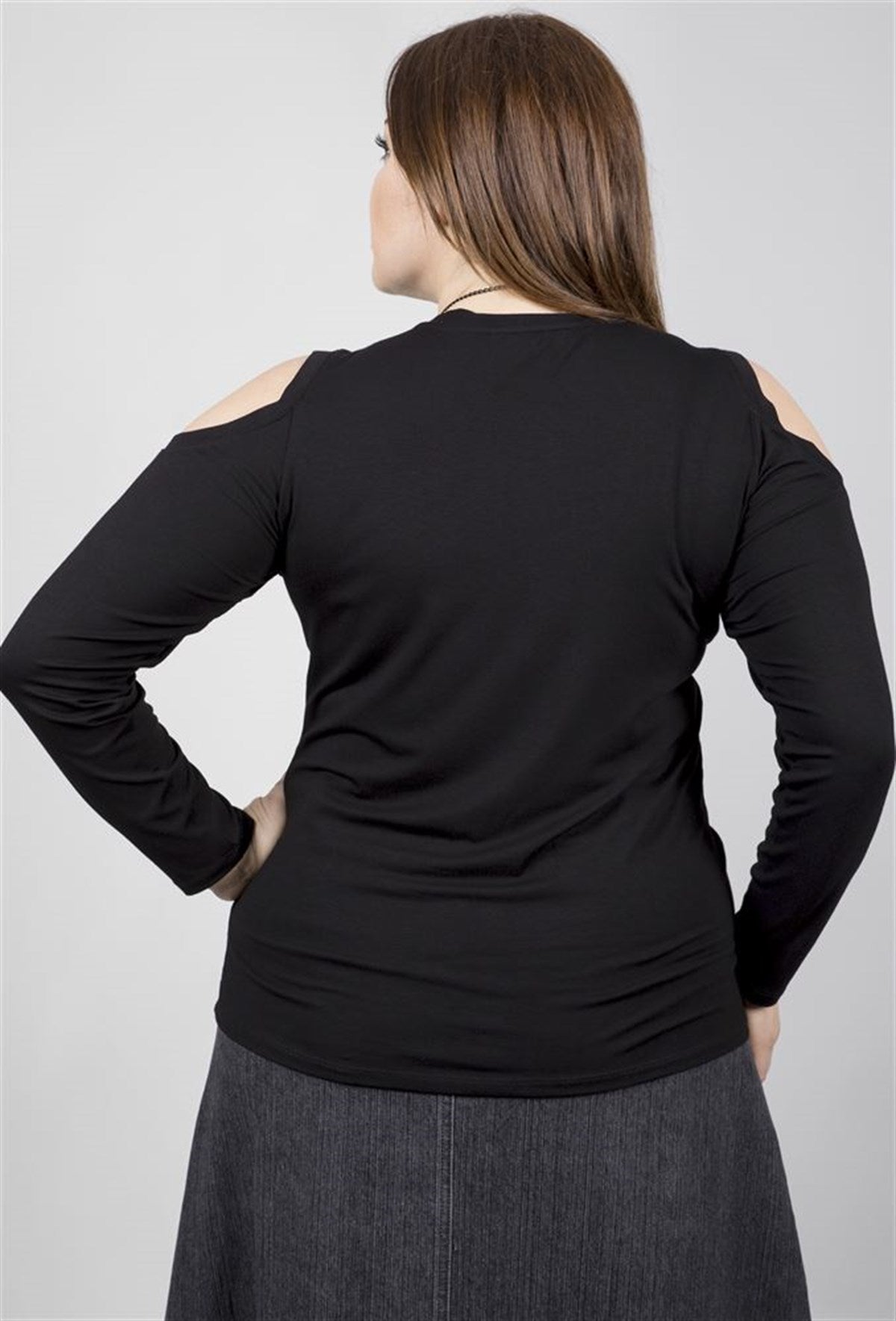 Omuzları Açık Kolyeli Uzun Kol Tişört