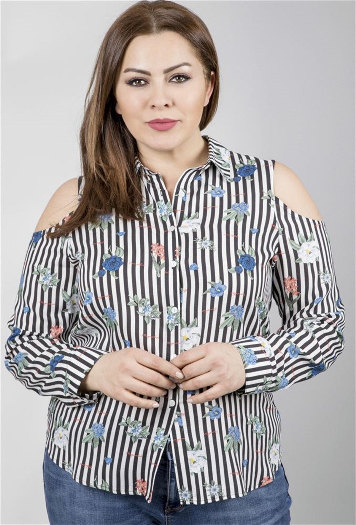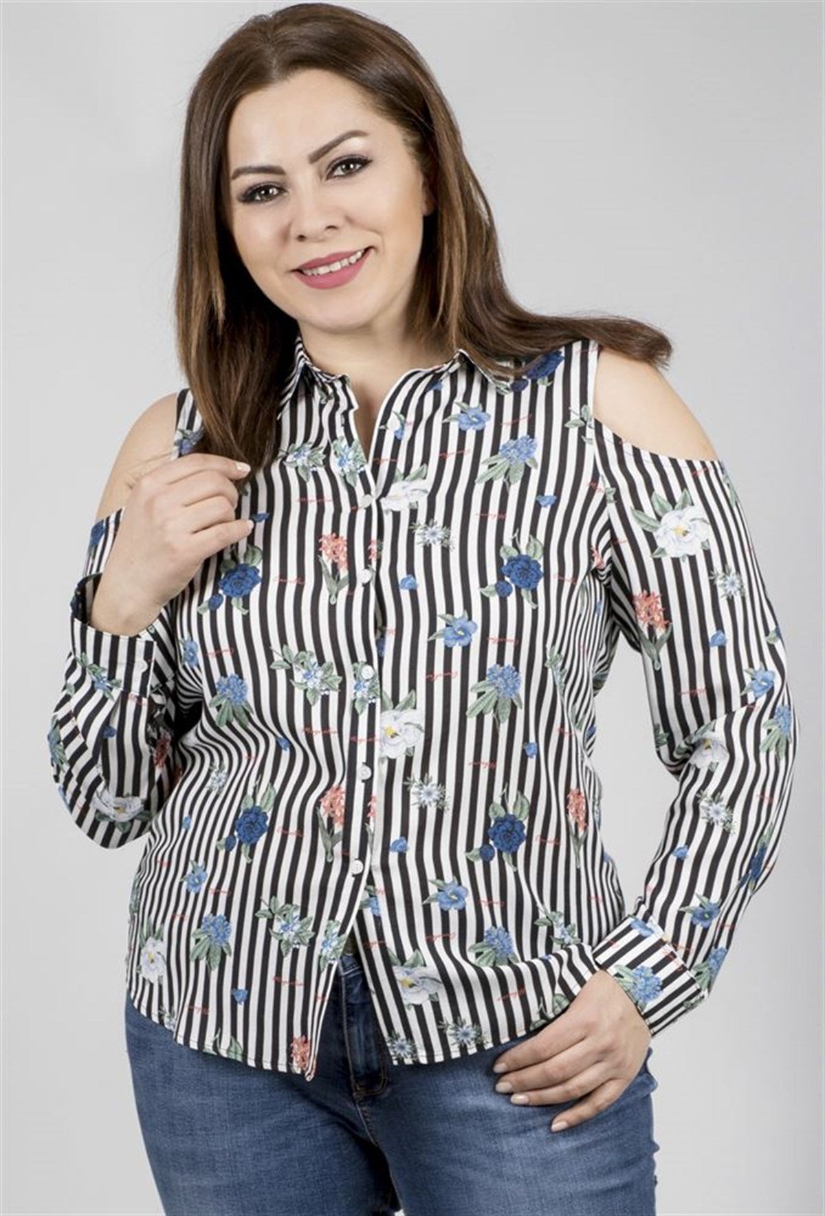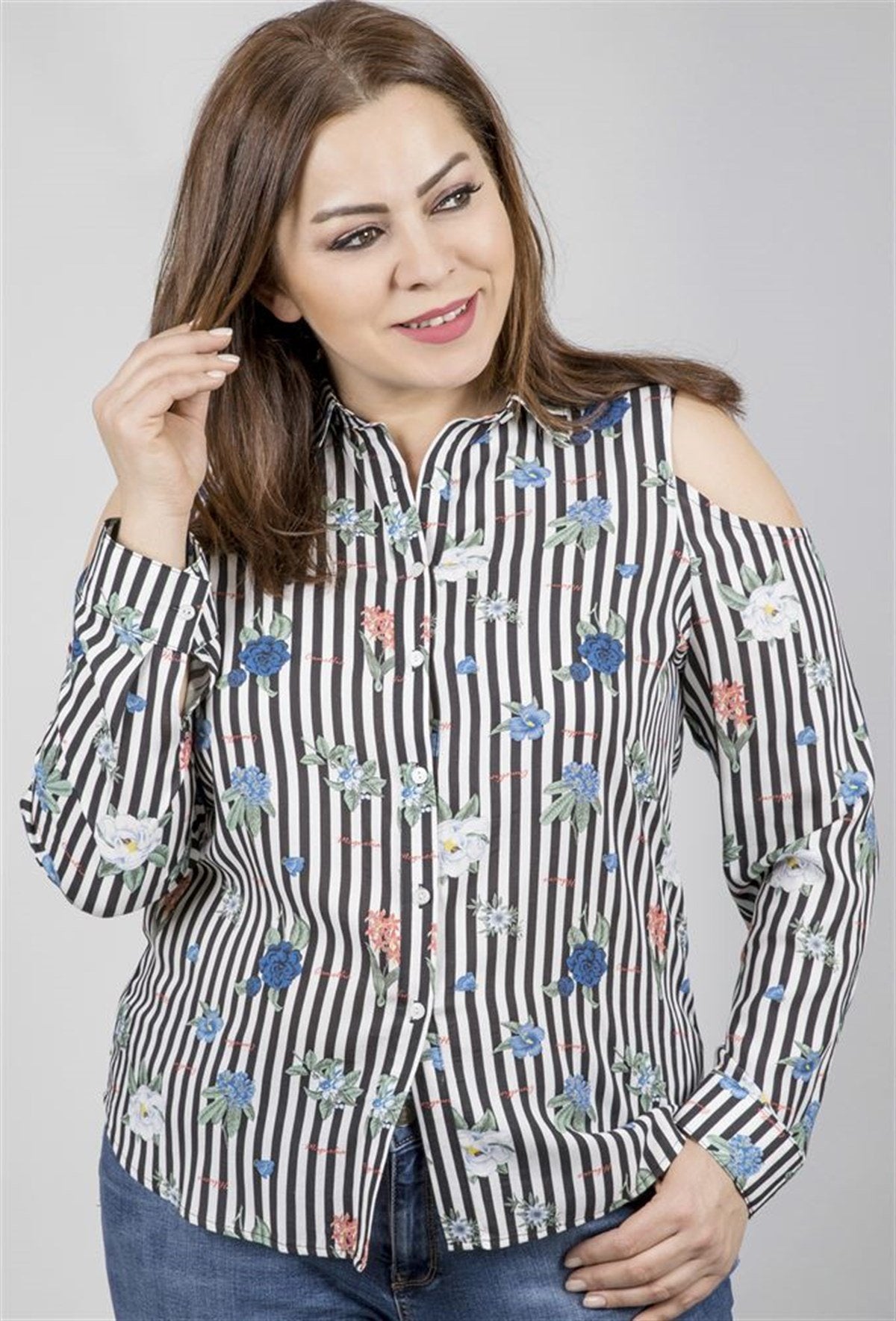Omuzları Açık Uzun Kollu Gömlek