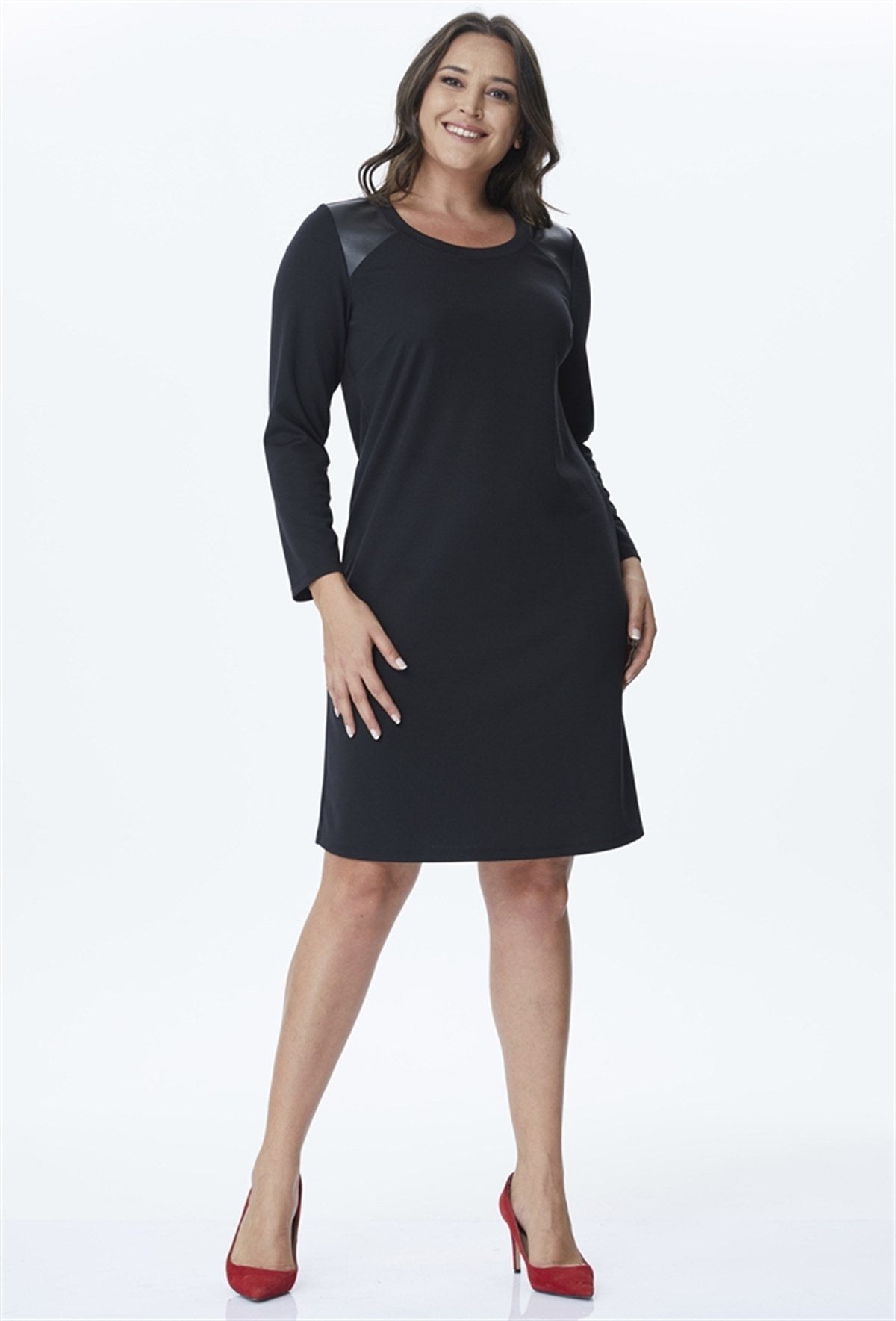 Omuzları Deri Detaylı Punto Elbise
