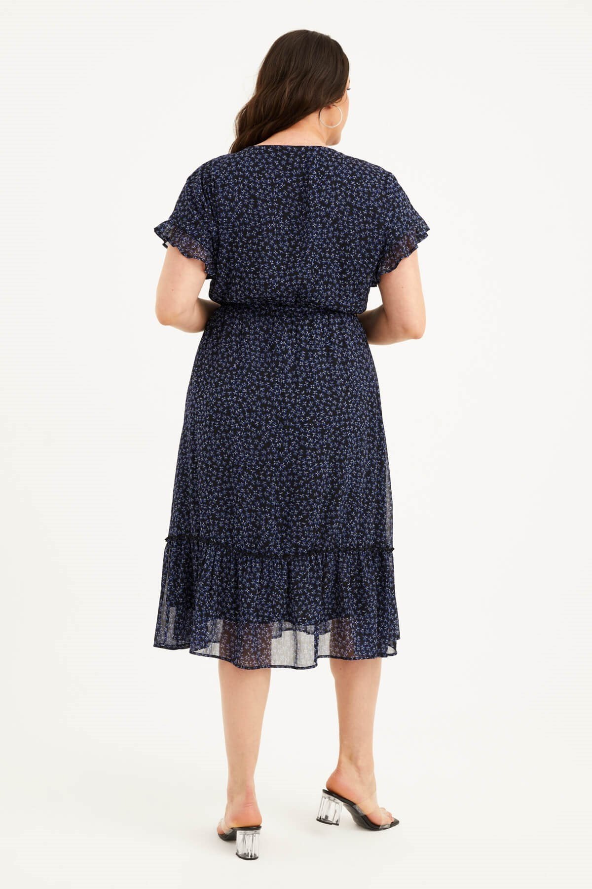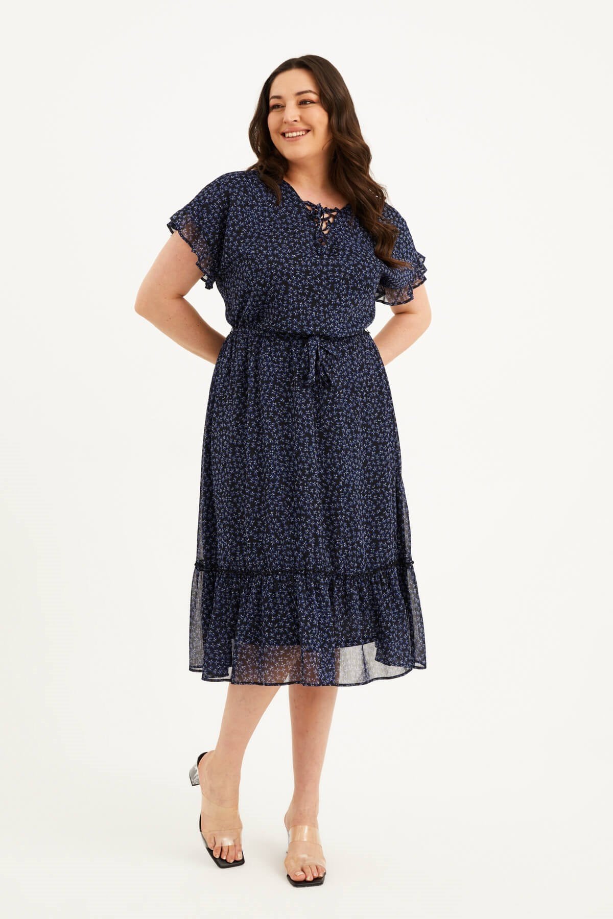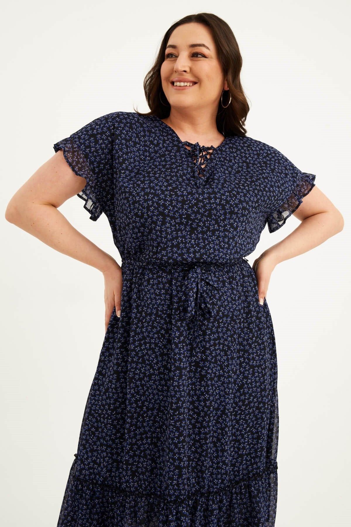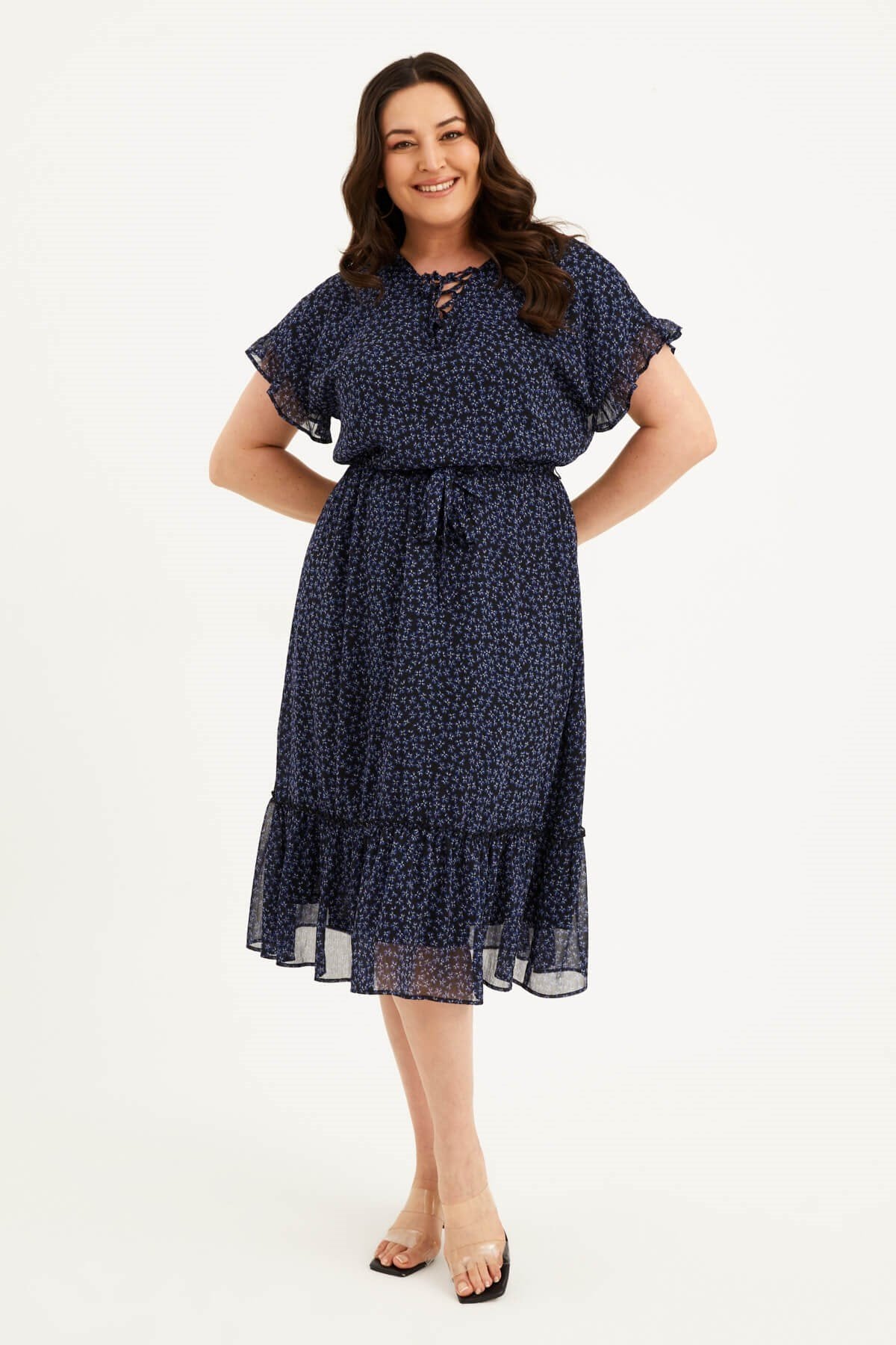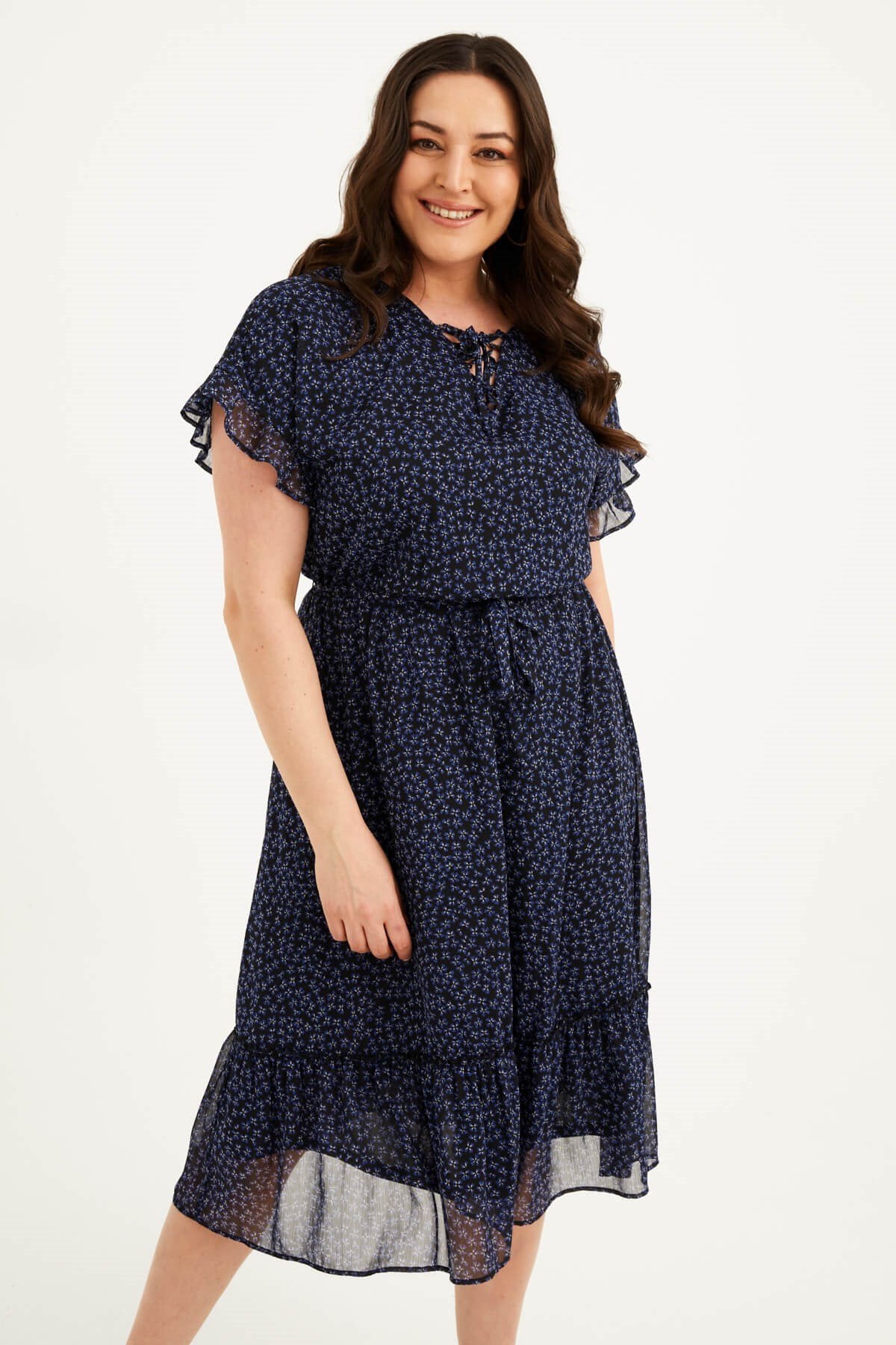 Önü Bağcıklı Fırfır Detaylı Şifon Elbise