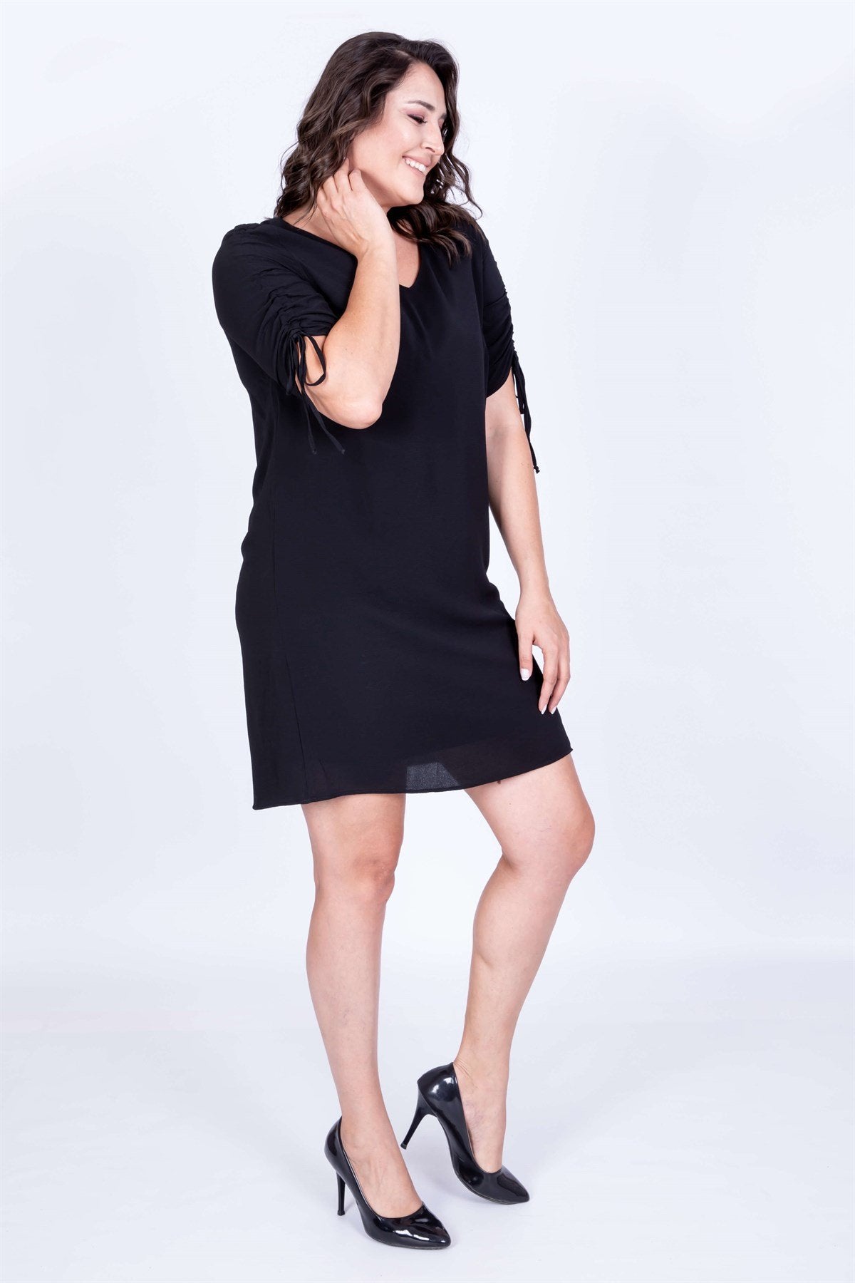 Siyah Kolları Büzgülü Astarlı Elbise