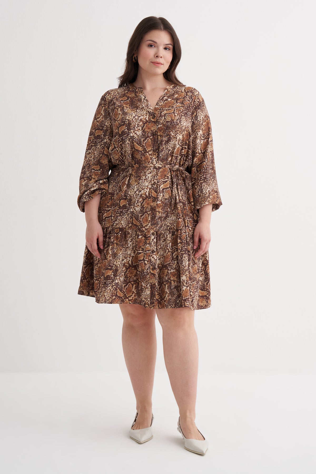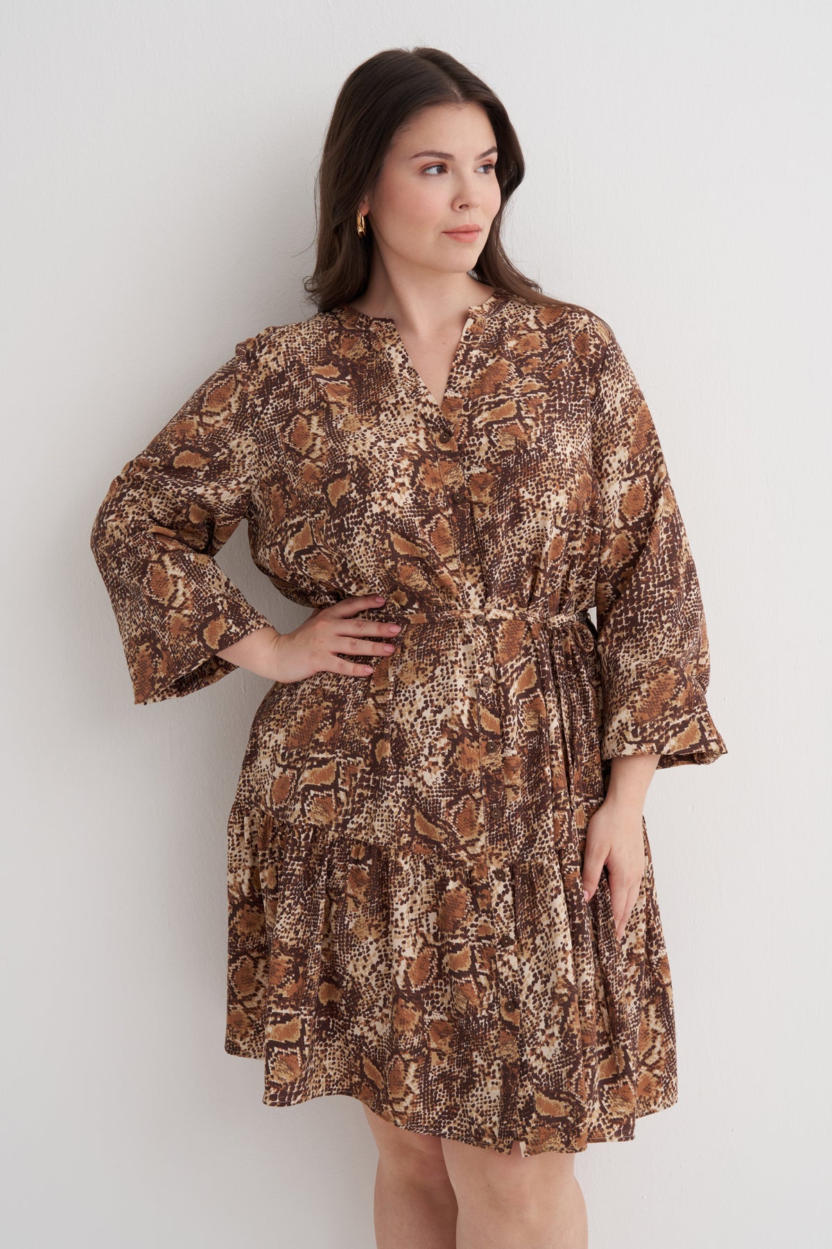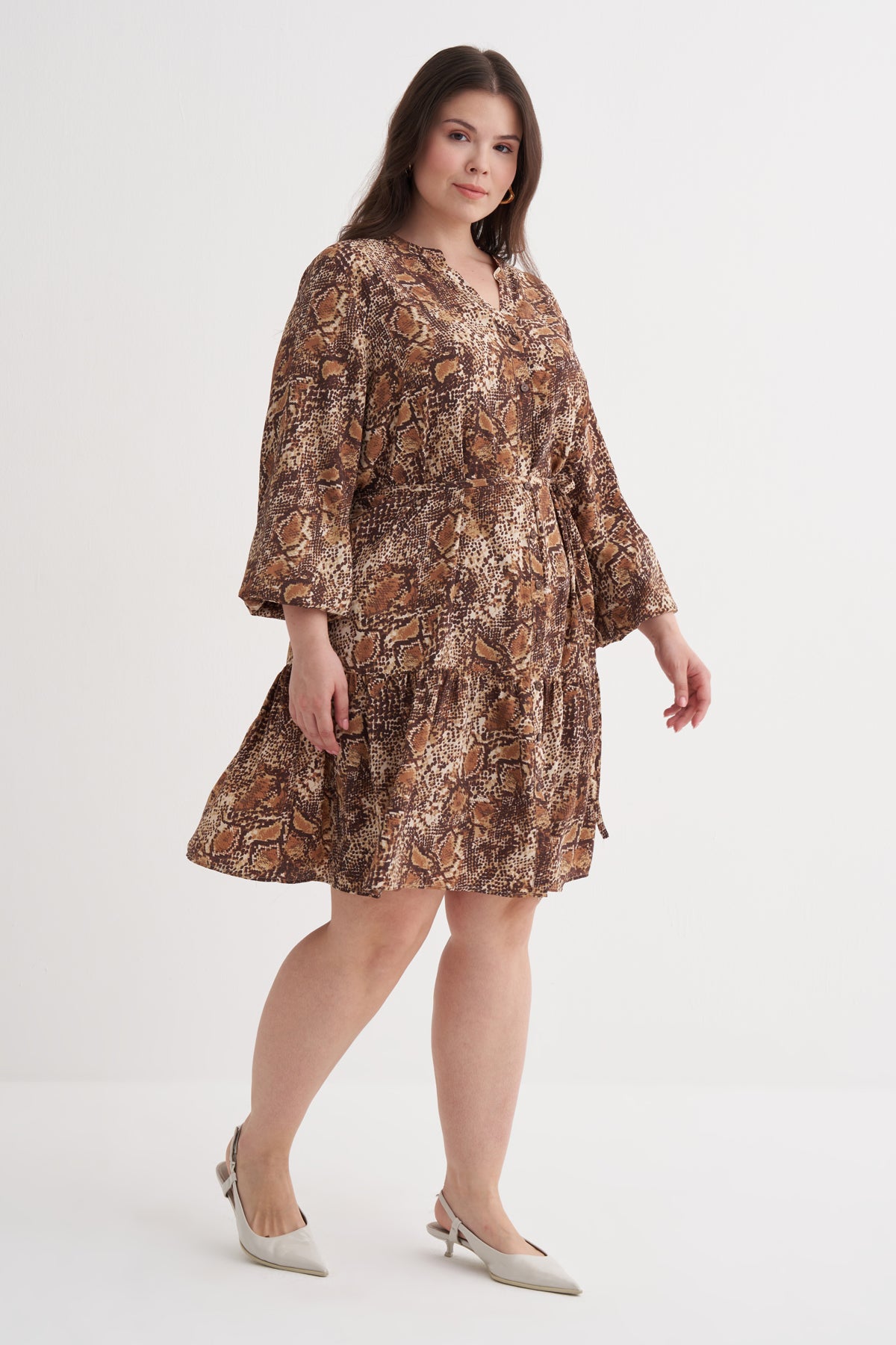 V Yaka Fırfır Detaylı Kuşaklı Elbise