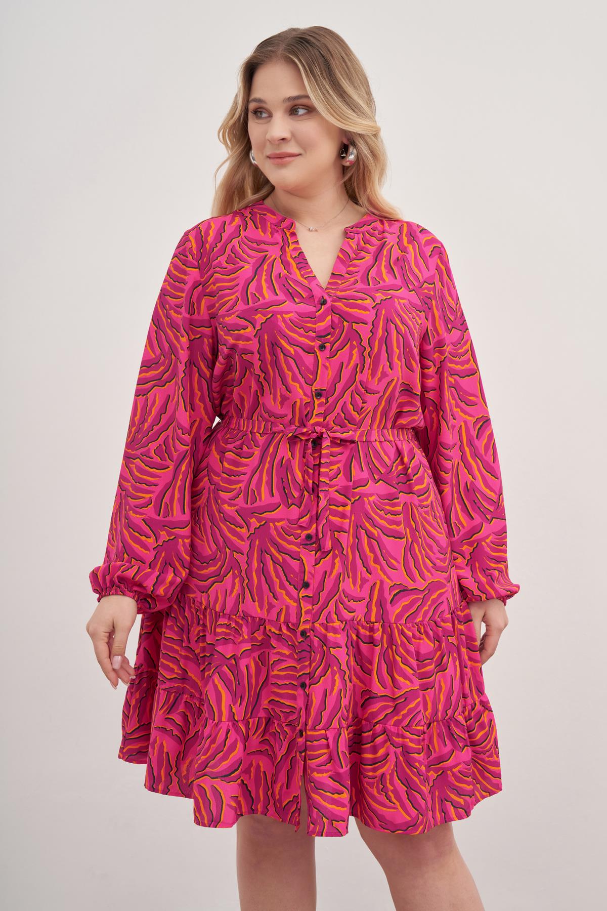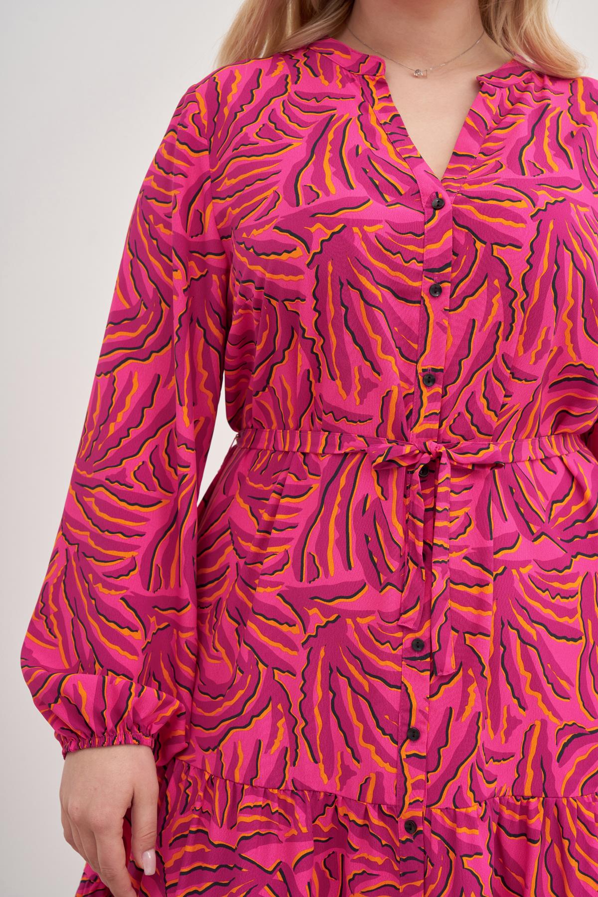 V Yaka Kuşaklı Önden Düğmeli Elbise